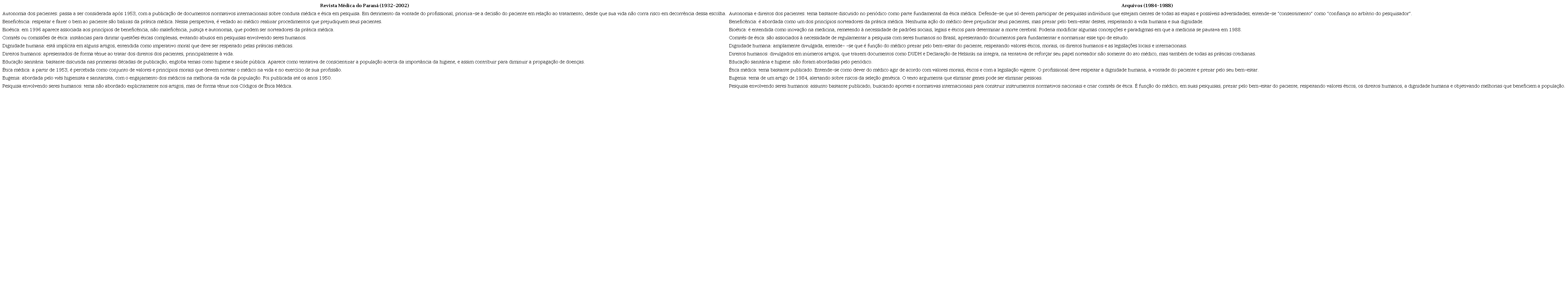 A partir de 1953, a Revista Médica do Paraná mudou seu perfil. Entre os assuntos passaram a prevalecer as técnicas e a ética do exercício profissional, especialmente o Código de Ética Médica 40, revelando mudança no ideário. Questões de educação sanitária tornaram-se mais raras, o que demonstra um novo fazer com a incorporação da ética médica 9. Observou-se a ausência de discussões éticas, sociais e políticas no período de 1964 a 1985, ante casos de violação dos direitos humanos no Brasil.