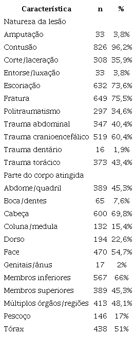 A Tabela 1 apresenta dados sobre a natureza das lesões, considerando diagnóstico e parte do corpo atingida. É importante ressaltar que a mesma vítima pode apresentar várias lesões, de tipos diversos e em diferentes partes do corpo. Dentre elas, a contusão foi a mais comum, seguida por fratura, escoriação e trauma cranioencefálico. A parte do corpo mais atingida é a cabeça, seguida dos membros inferiores, face, tórax, múltiplos órgãos/regiões, abdome/quadril e membros superiores.
