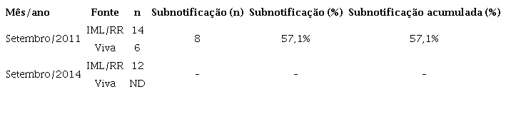 As Tabelas 2 e 3 comparam os resultados das pesquisas no IML/RR com dados do MS, Viva Inquérito e SIM. Ressalte-se que o Viva utilizou amostra probabilística do mês de setembro de 2011 como parâmetro nacional e, até a elaboração deste artigo, só disponibilizou dados de mortalidade desse ano, mesmo com a Portaria MS 708/2014 38, que liberou recursos financeiros para novo inquérito – já realizado, segundo o MS 39. A comparação entre laudos do IML/RR e dados do Viva Inquérito e do SIM traz evidências de subnotificação da mortalidade no trânsito em Roraima.