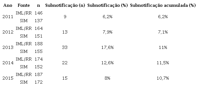 O estudo comparou os referidos laudos do IML/RR com as fontes do MS a fim de verificar se há de fato a subnotificação de mortalidade descrita na literatura 10,16,17. Por meio das frequências absolutas e relativas, realizou-se análise exploratória da totalidade dos dados obtidos 37.