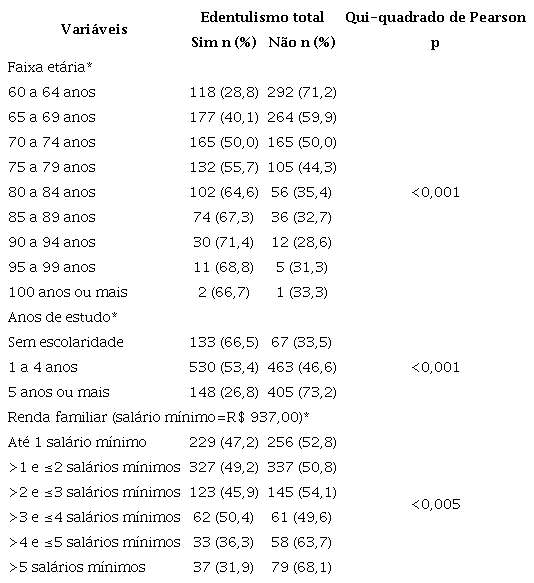 O percentual de idosos com perda dentária total tendeu a aumentar linearmente com o avanço da idade, sendo 28,8% dos participantes de 60 a 64 anos e 71,4% de 90 a 94 anos edêntulos totais (p<0,001). Os indivíduos com cinco anos ou mais de estudo apresentaram menor percentual de edentulismo total (26,8%) quando comparados com idosos sem escolaridade (66,5%) ou com aqueles que tinham de um a quatro anos de estudo (53,4%) (p<0,001). Idosos com renda familiar mensal equivalente a mais de cinco salários mínimos apresentaram menor percentual (31,9%) de perda total de dentes quando comparados aos anciãos com menor renda (Tabela 1).