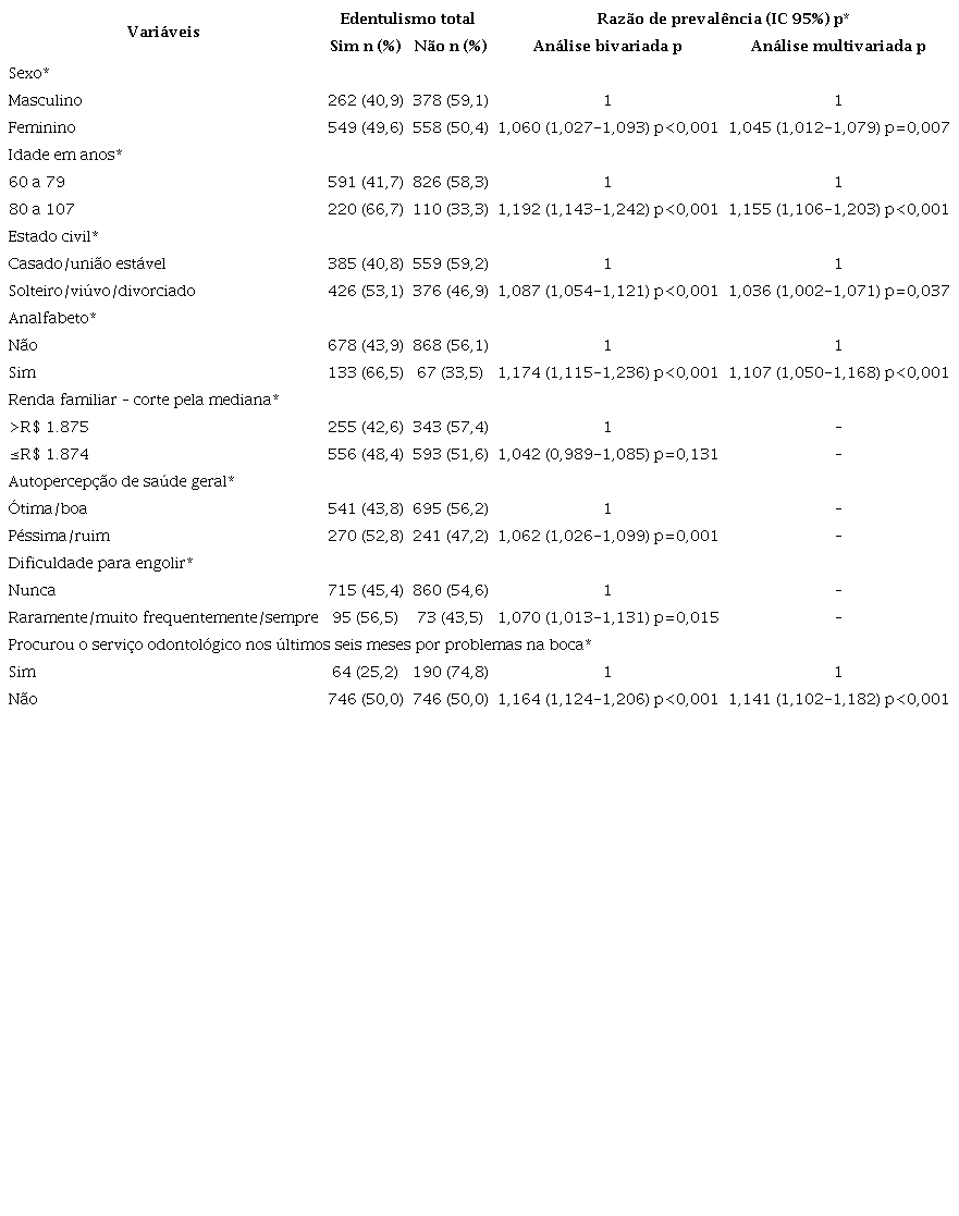 O edentulismo total foi mais prevalente em participantes do sexo feminino (RP=1,060), com 80 anos ou mais (RP=1,192), solteiros/viúvos/divorciados (RP=1,087), analfabetos (RP=1,174), com autopercepção de saúde geral péssima/ruim (RP=1,062), com dificuldade para engolir alimentos (RP=1,070) e que não procuraram pelo serviço odontológico por problemas na boca nos seis meses que antecederam a pesquisa (RP=1,164), com nível de significância estatística de p<0,05 na análise bivariada. Na análise multivariada mantiveram-se associados à maior prevalência de edentulismo total entrevistados do sexo feminino (RP=1,045), com 80 anos ou mais (RP=1,155), solteiros/viúvos/divorciados (RP=1,036), analfabetos (RP=1,107) e que não procuraram o serviço odontológico por problemas na boca nos seis meses anteriores à pesquisa (RP=1,164), conforme demonstrado na Tabela 2.