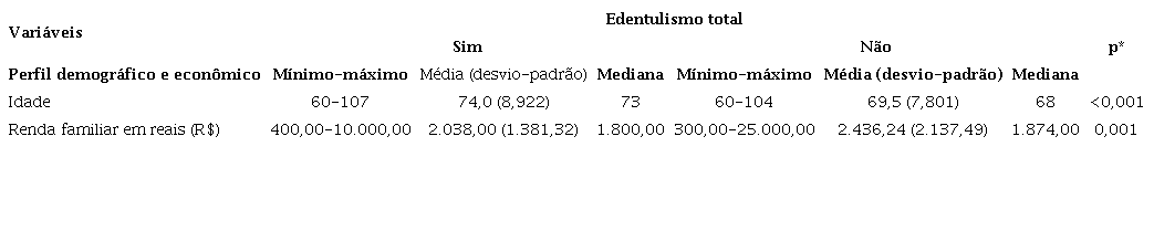 Entre os edêntulos totais, a idade mediana foi 73 anos, e entre os não edêntulos foi 68 anos (p<0,001). Os edêntulos totais apresentaram menor renda (em média quase R$ 400 a menos que os sem edentulismo total), com diferença significativa (Tabela 3).