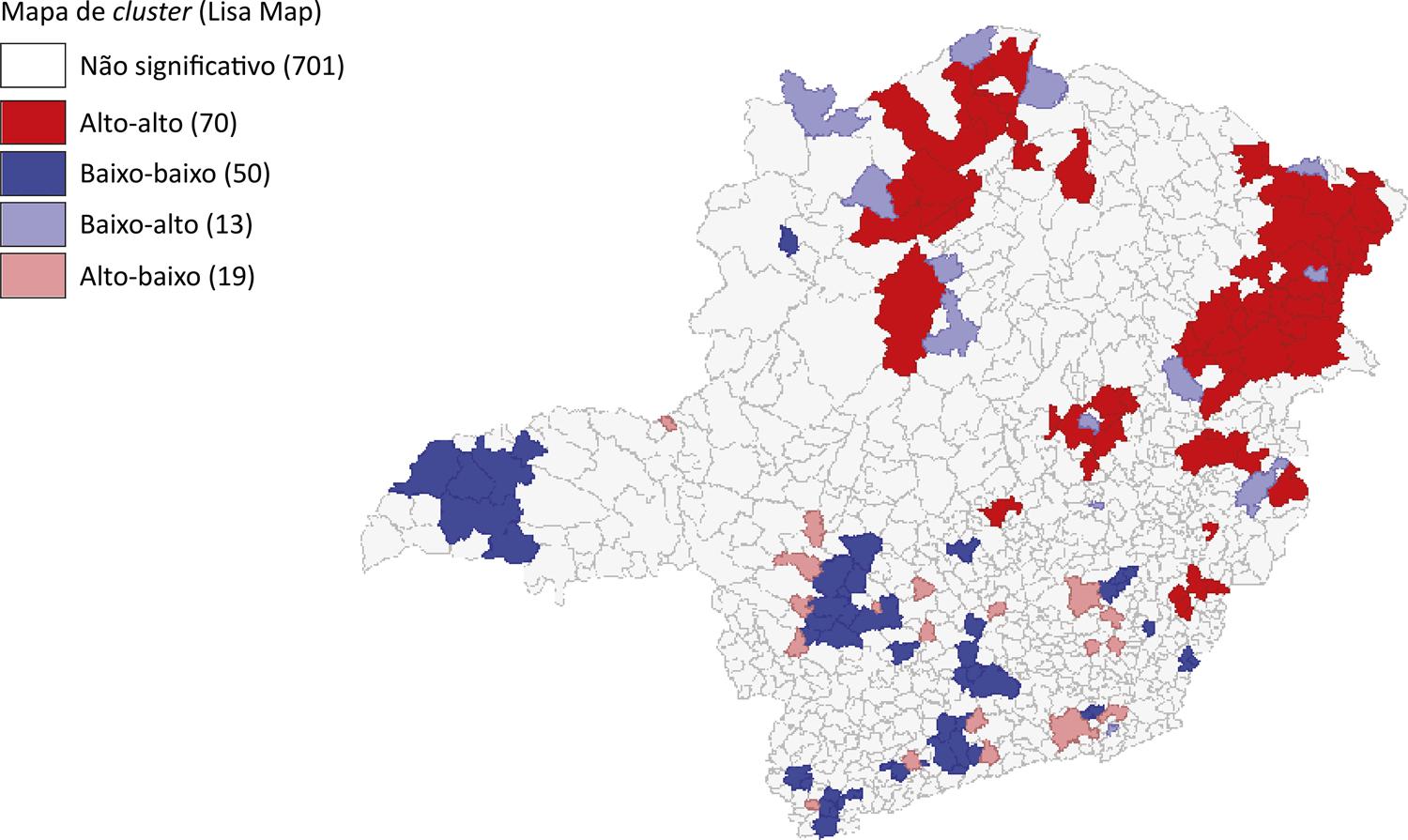 O método descrito permitiu identificar aglomerados de mortalidade por causas evitáveis entre menores de 5 anos principalmente nas mesorregiões Norte, Jequitinhonha e Vale do Mucuri 10 , representadas na Figura 1 em cor vermelha. Esses aglomerados, identificados como alto-alto ( high-high ), indicam os municípios com altos índices de mortalidade infantil que são rodeados por outros municípios também com alta incidência, caracterizando assim o cluster (Lisa). Por outro lado, os aglomerados azuis indicam os munícipios de baixa incidência de mortalidade infantil por causas evitáveis entre menores de 5 anos, cujos vizinhos também se caracterizam por essa baixa incidência.