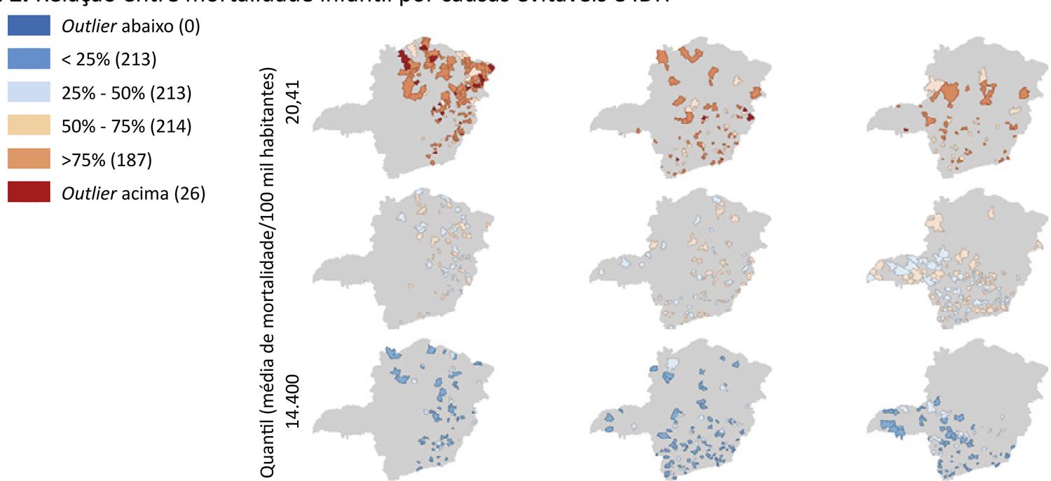 Os mapas da Figura 2 mostram a mortalidade infantil por causas evitáveis (evento em estudo) e o IDH (fator relacionado) de acordo com a distribuição espacial. A partir da representação do IDH no eixo horizontal e do índice de mortalidade no eixo vertical, observa-se que os municípios com altos índices de mortalidade infantil são os que têm menor IDH.