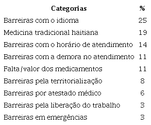 A partir da fala dos participantes, foram detectados os principais obstáculos ao acesso à saúde. Essas vulnerabilidades foram organizadas em categorias, segundo o método da análise de conteúdo. São elas: barreiras com o idioma; medicina tradicional haitiana; barreiras com o horário de atendimento; barreiras com a demora no atendimento; falta/valor dos medicamentos; barreiras pela territorialização; barreiras por atestado médico; barreiras pela liberação do trabalho; e barreiras em emergências.