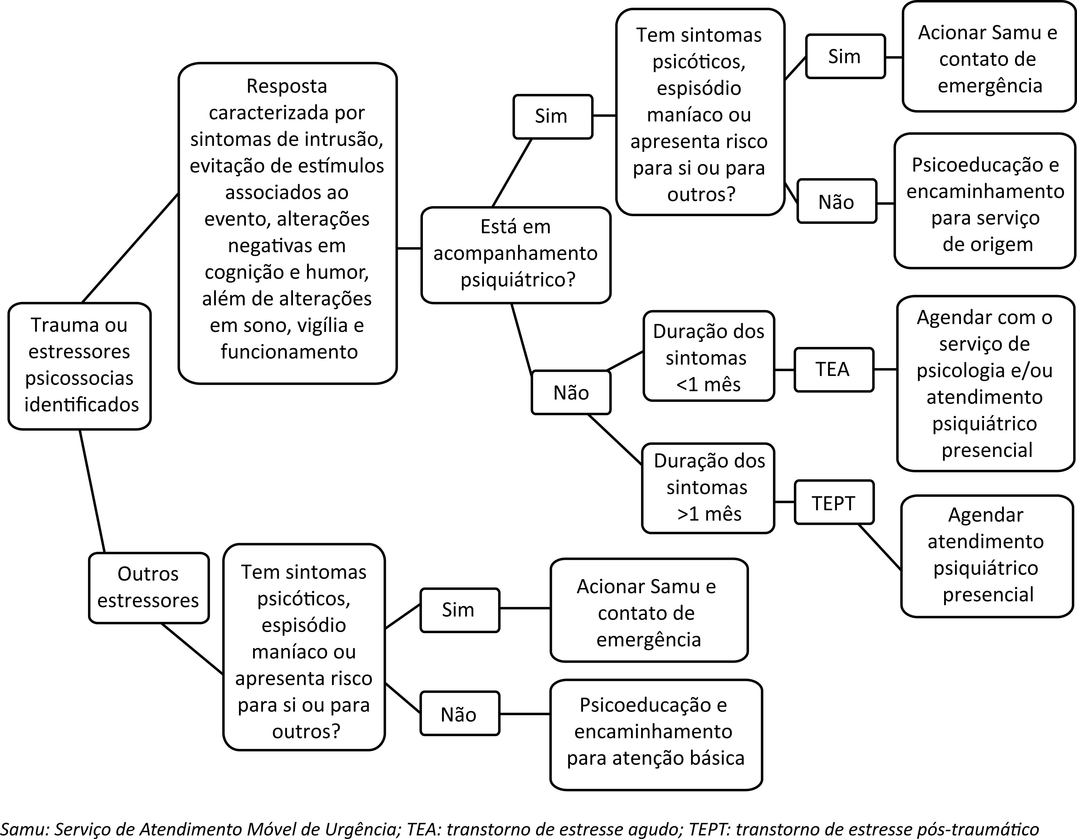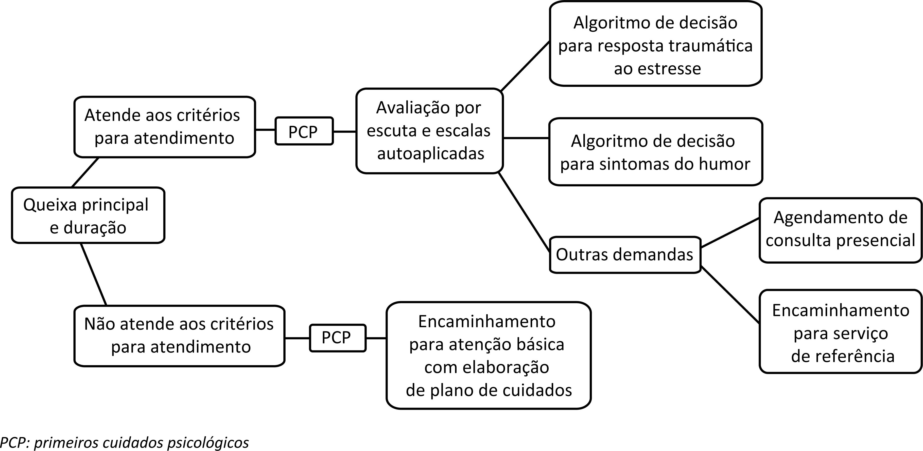 Durante a triagem, todos os profissionais eram acolhidos e recebiam os PCP. Ao serem identificados eventos traumáticos e estressores psicossociais (associados ou não a sintomas do humor), procedia-se à investigação ativa acerca de presença e duração de sintomas de intrusão, comportamentos evasivos relacionados ao evento, alterações cognitivas, sintomas do humor e alterações funcionais e do ciclo sono-vigília. Quando identificados sintomas do humor na ausência de evento traumático, o profissional era direcionado para atendimento de acordo com a gravidade. O uso de substâncias psicoativas, risco de suicídio ou condições clínicas associadas eram ativamente investigados.
