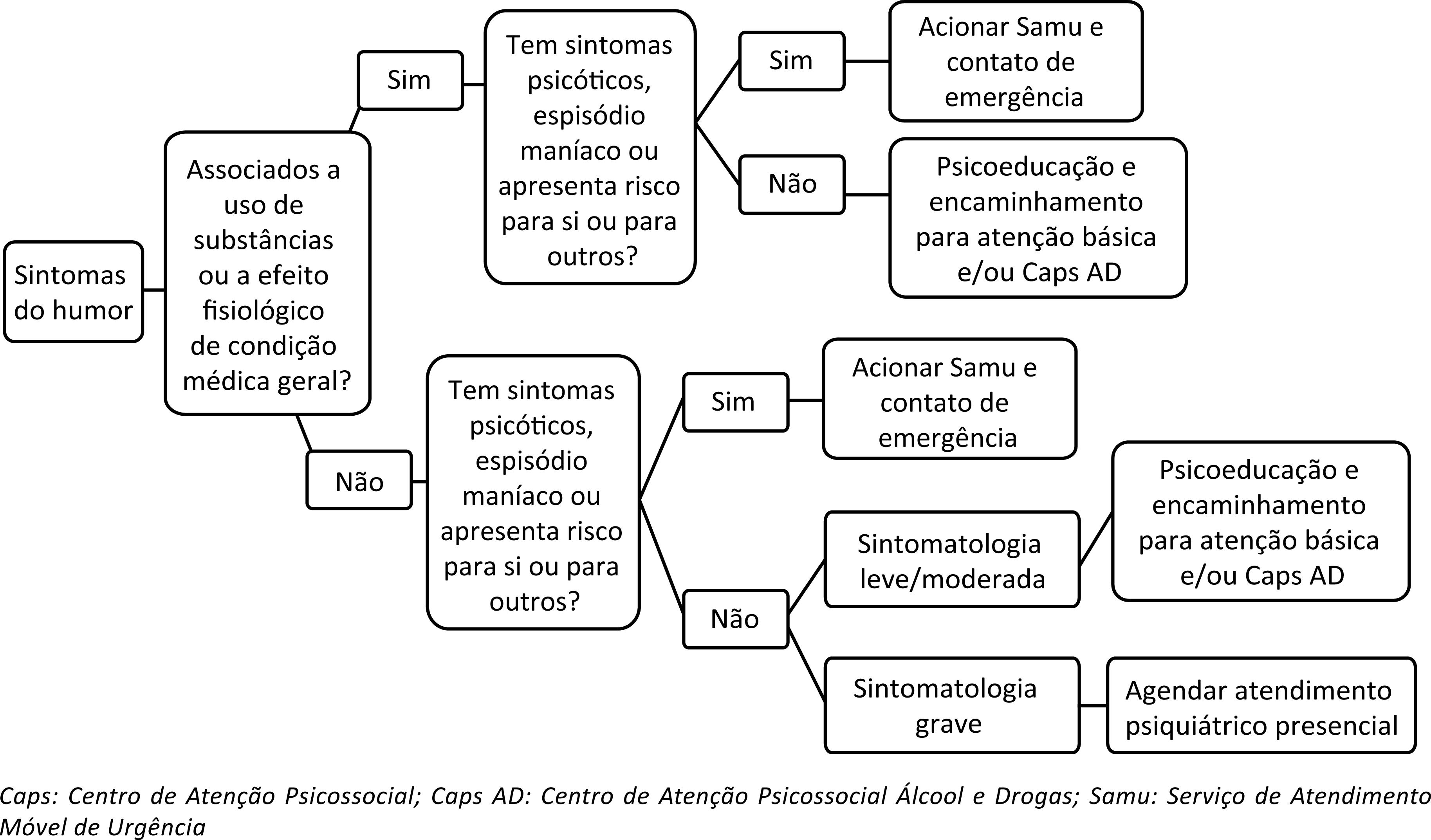 Em virtude da ausência de recomendações específicas para teleatendimento psiquiátrico, alguns cuidados especiais foram tomados, como a exigência de contato de emergência, que deveria ser acionado imediatamente antes do início do atendimento remoto. Estabeleceu-se que os teleatendimentos fossem realizados pelos profissionais no espaço físico do serviço, em consultório, e registrados em prontuário. Nos casos em que durante o atendimento fossem observadas possíveis alterações do nível de consciência, risco de suicídio ou homicídio, sintomas psicóticos ou maníacos, o contato de emergência e o Samu eram acionados para encaminhamento imediato ao serviço de emergência (clínica ou psiquiátrica). Visando padronizar condutas e facilitar a tomada de decisão, algoritmos foram criados ( Figuras 1 e 2).