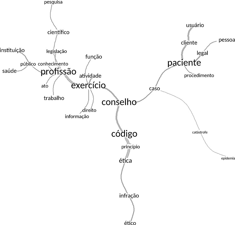 O método de análise de similitude aplicado permitiu identificar a conexão entre elementos da representação ( Figura 1). As palavras com maior destaque demonstraram relevância para a conexão de elementos 26. A análise de similitude também possibilitou a representação gráfica dos dados do corpus, facilitando a compreensão das informações 35. Tal análise, ancorada na teoria dos grafos, identifica ocorrências dos termos e conexões entre eles, permitindo visualizar a estrutura do corpus textual 26, 35, 36.