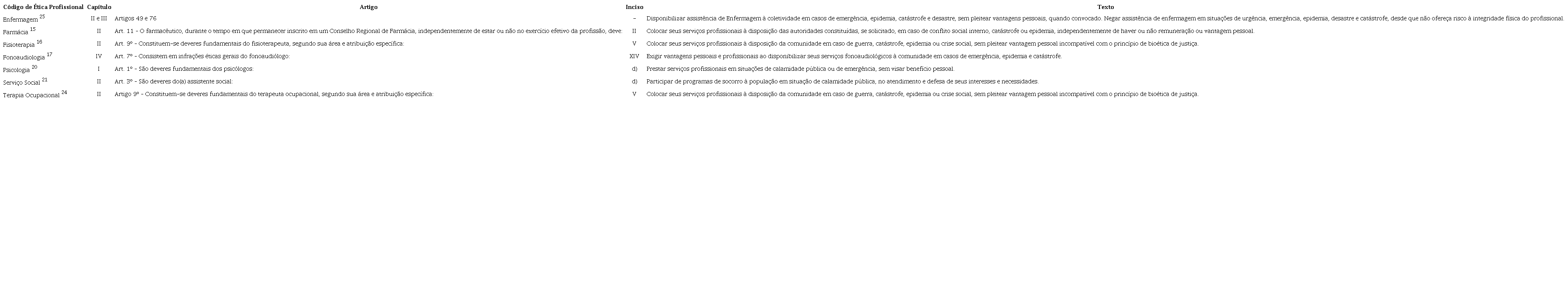 Pode-se observar no Quadro 1 que a maioria dos códigos atribui ao profissional a responsabilidade e o dever de colocar seus serviços à disposição da sociedade em caso de epidemia, catástrofe ou calamidade. A exceção é o código de fonoaudiologia, que ao tratar do tema destaca a infração quanto a possível vantagem obtida pelo profissional nessas situações (infração semelhante consta do código de enfermagem, com ênfase no ato de negar assistência).
