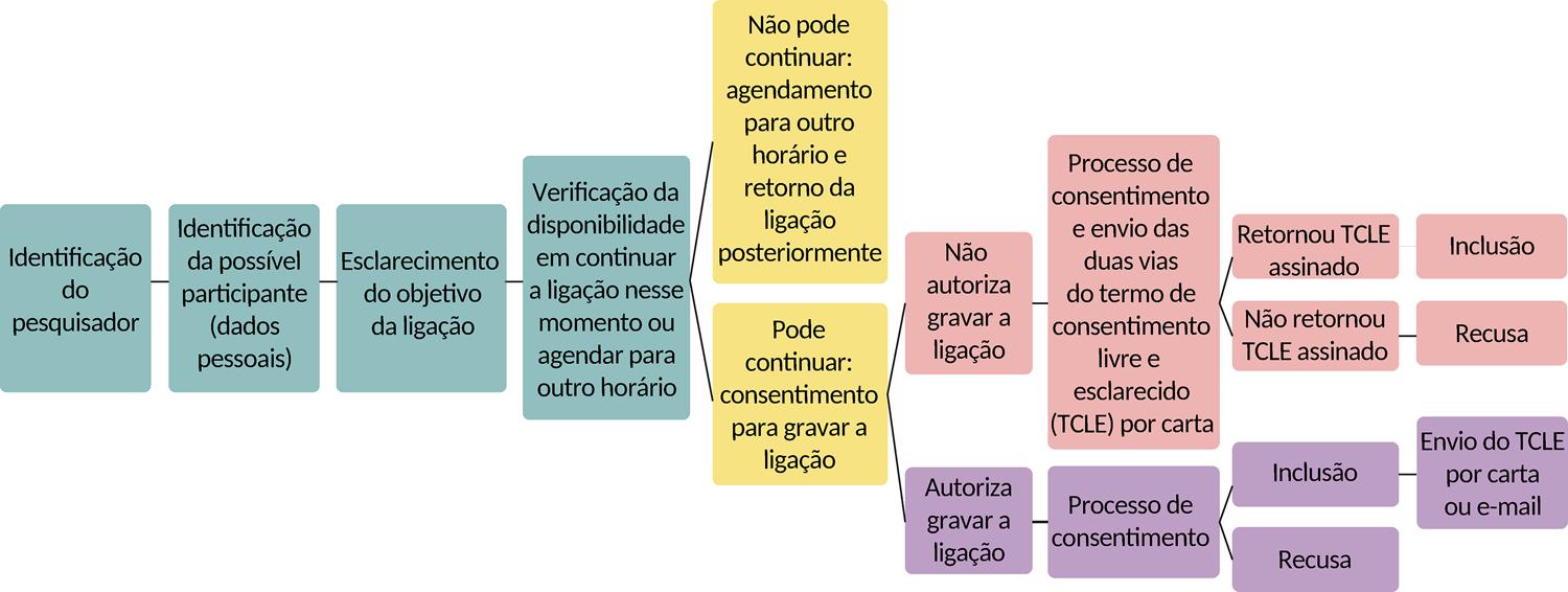 As pacientes foram contatadas por celular, entre as 9 e as 19 horas, pelos próprios pesquisadores. O roteiro telefônico (Anexo) foi aprovado por Comitê de Ética em Pesquisa. Na ligação, os pesquisadores apresentavam o estudo e perguntavam à paciente se podiam iniciar o processo de consentimento. Em caso de resposta afirmativa, pedia-se autorização para gravar a conversa. As gravações foram realizadas por meio de um aplicativo gratuito para celular. Todos os elementos do consentimento informado eram então lidos e, caso a paciente aceitasse participar do estudo, o termo de consentimento livre e esclarecido (TCLE) era enviado por e-mail ou correspondência, de acordo com a preferência da destinatária.