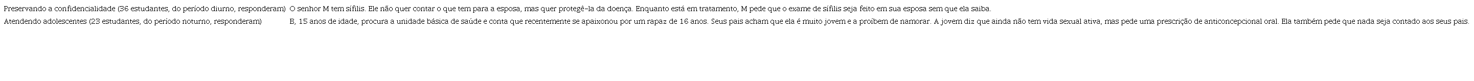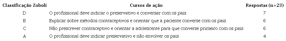 Com relação à situação “Atendendo adolescentes”, os dois extremos em conflito são o respeito à confidencialidade da adolescente e o respeito à responsabilidade dos pais 6. Nesta situação, verifica-se que a maioria dos estudantes optou por orientar a adolescente quanto ao uso de métodos contraceptivos ( Quadro 3).
