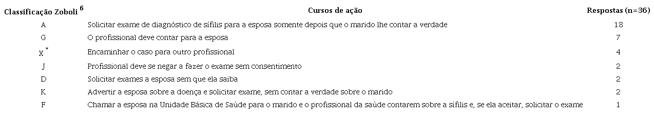 Segundo Zoboli 6, para a situação “Preservando a confidencialidade” ( Quadro 1), os possíveis cursos de ação se situam entre dois extremos: ou se sacrifica a veracidade na relação clínica, mentindo para a esposa, ou se respeita a confidencialidade e privacidade do marido. O Quadro 2 apresenta a categorização das respostas dos participantes do presente estudo, comparando-as com os cursos de ação encontrados no trabalho de Zoboli 6.