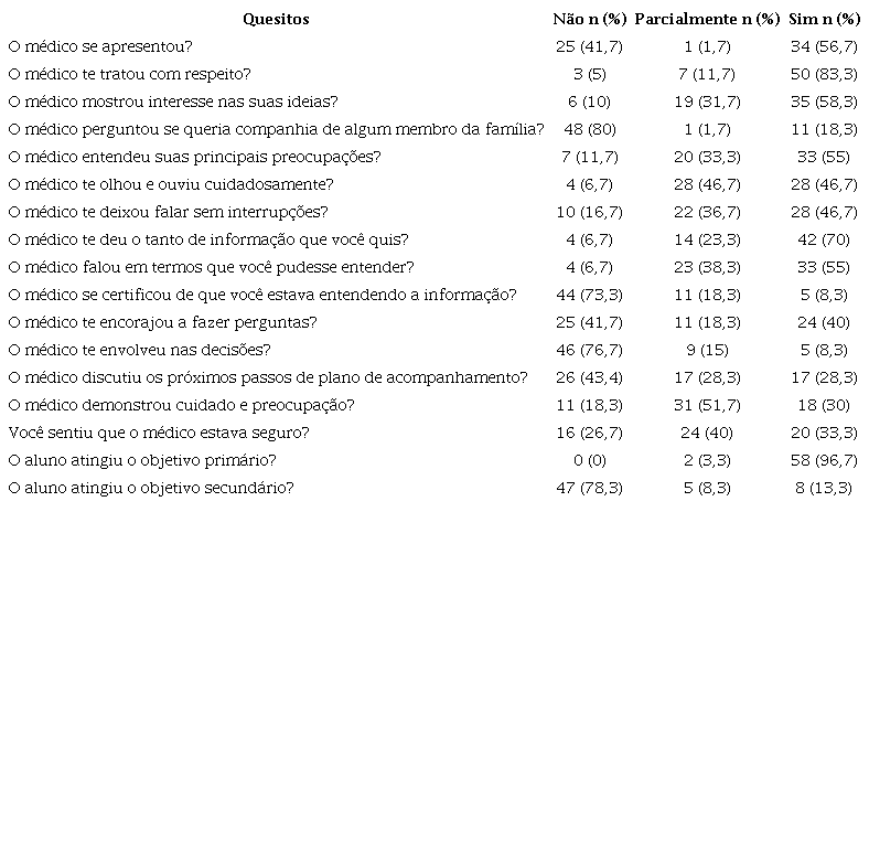 A média de pontuação total dos participantes foi de 19 pontos, com mediana 19 (desvio padrão ±6,1). O escore mínimo obtido foi de 7 e o máximo foi de 34. O objetivo primário da cena era que o aluno informasse a má notícia; 58 (96,7%) conseguiram cumpri-lo, e apenas 2 (3,3%) o fizeram parcialmente. O objetivo secundário era que o aluno identificasse e abordasse alguma característica importante da paciente – que expressava esta característica de maneira evidente. Apenas 8 (13,3%) dos participantes cumpriram esse objetivo, 5 (8,3%) cumpriram parcialmente, e a maioria não o fez (47; 78,3%).