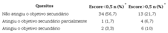 Quanto à relação entre atingir ou não o objetivo secundário e o escore obtido (menor ou maior que 0,5), foi possível obter os seguintes resultados: 34 participantes (56,7%) não atingiram o objetivo secundário e tiveram escore insuficiente (<0,5); 13 participantes (21,7%) não atingiram o objetivo secundário, mas obtiveram escore considerado suficiente (>0,5). Um participante (1,7%) atingiu o objetivo secundário de maneira parcial e obteve escore insuficiente; 4 participantes (6,7%) atingiram o objetivo secundário parcialmente e escore considerado suficiente; 2 participantes (3,3%) atingiram o objetivo secundário de maneira total, mas não obtiveram escore suficiente; 6 participantes (10%) atingiram o objetivo secundário e obtiveram escore considerado suficiente, pelo teste exato de Fisher, com p=0,0034. Dentre os participantes que não atingiram o objetivo secundário (n=47), 34 (72,34%) não atingiram o escore considerado suficiente. Dos participantes que atingiram o objetivo secundário total ou parcialmente (n=13), 8 (61,54%) atingiram o escore considerado suficiente. Dentre os participantes que atingiram o objetivo secundário completamente (n=8), 6 (75%) atingiram o escore considerado suficiente ( Tabela 2).