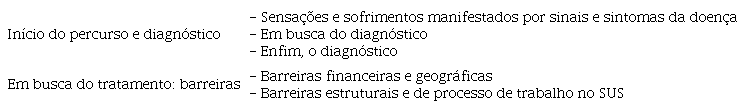 Os questionamentos sobre o itinerário terapêutico permitiram refletir sobre o acesso a serviços, a resolutividade do cuidado e os saberes populares de usuários do SUS. O itinerário descreve o percurso na rede de atenção, a definição do diagnóstico e tudo que se relaciona com a doença 12. Nessa perspectiva, duas categorias analíticas foram destacadas nos discursos: “início do percurso e diagnóstico” e “em busca do tratamento: barreiras”, com suas respectivas subcategorias ( Quadro 1).
