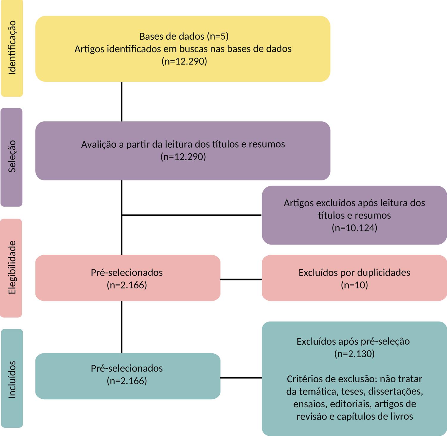 Foram incluídos artigos publicados entre junho de 2013 e junho de 2018, a partir de seleção por conveniência. A busca ocorreu entre julho e agosto de 2019, nas bases de dados Medical Literature Analysis and Retrieval System Online (Medline/PubMed), Literatura Latino-Americana e do Caribe em Ciências da Saúde (Lilacs), Scientific Electronic Library Online (SciELO), Índice Bibliográfico Español en Ciencias de la Salud (Ibecs) e Cumulative Index to Nursing and Allied Health Literature (Cinahl). Utilizaram-se os seguintes descritores, em português, inglês e espanhol, extraídos dos Descritores em Ciências da Saúde (DeCS) e Medical Subject Headings (MeSH): “emergency medical services”, “patient care team”, “attitude of health personnel” e “palliative care”.