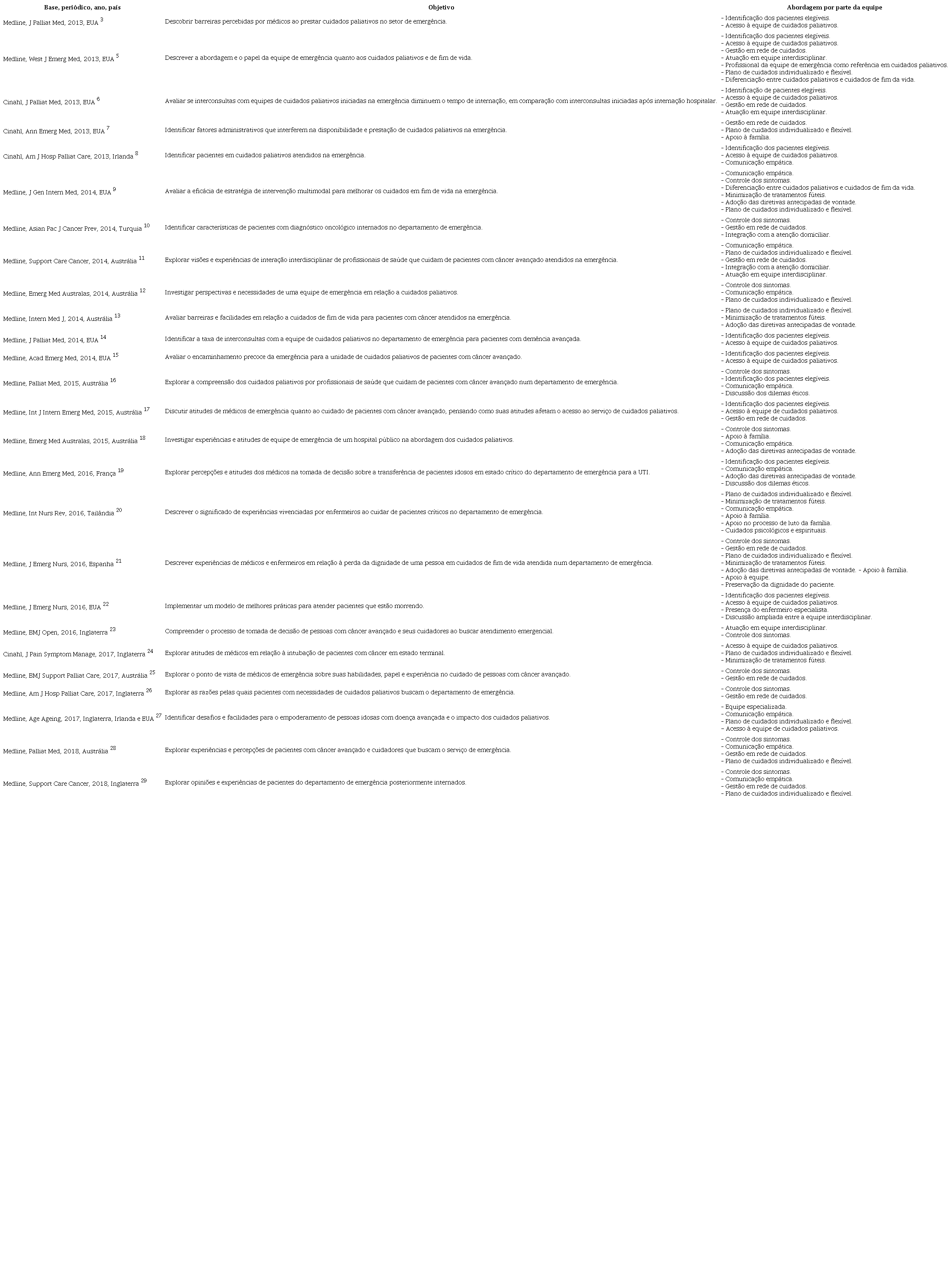 Os princípios éticos foram observados, com a devida citação aos autores incluídos. Os resultados foram analisados de forma descritiva, a partir de síntese da abordagem de equipes de emergência à assistência a pacientes em cuidados paliativos e de comparações entre as pesquisas incluídas.