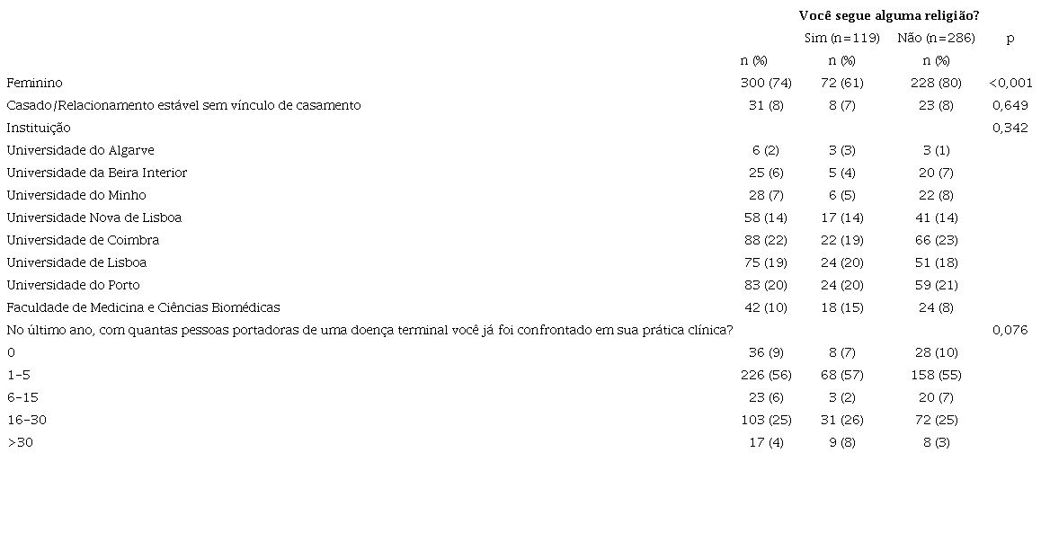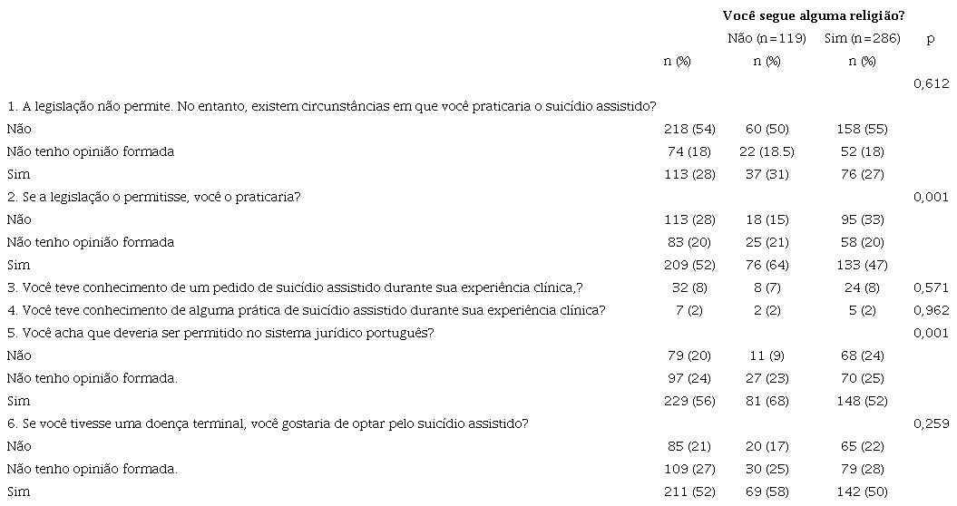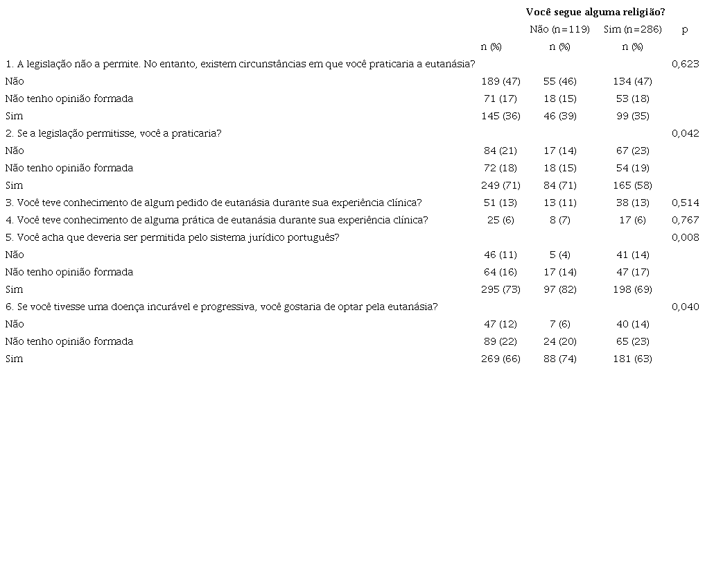 Em relação à eutanásia, foram verificadas diferenças significativas entre os respondentes que tinham religião e os que não tinham nas questões sobre a possibilidade de praticar a eutanásia caso permitida ( p =0,042), sobre se deveria ser permitida no ordenamento jurídico português ( p =0,008) e se o participante gostaria de optar pela eutanásia em caso de doença terminal ( p =0,04): os entrevistados que não tinham religião eram mais propensos a alegar que realizariam a eutanásia se fosse permitido por lei em comparação àqueles com religião, mesmo após ajuste para gênero (OR=1,858, p =0,01).