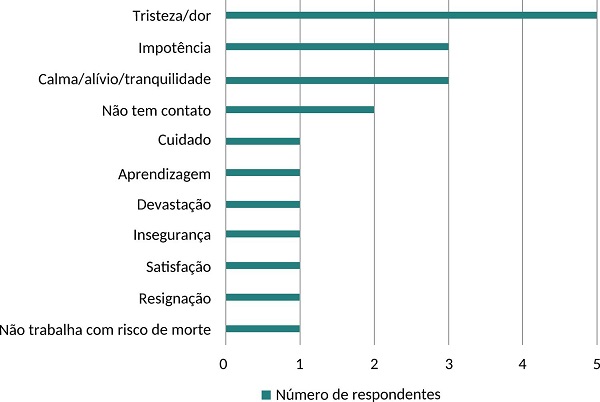 Em relação ao sentimento de realização/frustração profissional diante da morte de um paciente, em uma questão com resposta livre, cinco docentes (22,72%) referiram dor/tristeza, três (13,63%) declararam impotência, três (13,63%) afirmaram sentir calma/alívio/tranquilidade, ao passo que dois (9,09%) relataram que não têm contato e dois (9,09%) estatuem que nunca vivenciaram essa experiência ( Gráfico 1 ). Percebe-se que, ao ser apontada tristeza e impotência como resposta mais frequente, a formação profissional para lidar com a morte ainda não é satisfatória. O despreparo dos profissionais de saúde advém da importância dada ao tema da vida, fomentando, assim, o sentimento de fracasso em situação de óbito do paciente 17 .