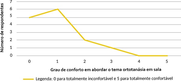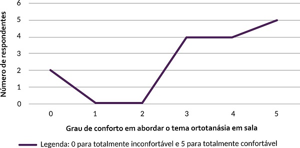 A maioria dos docentes respondeu se sentir bem para abordar a temática da morte em sala de aula. Em uma escala de zero a cinco para indicar o grau de conforto com o tema, sendo cinco o nível mais confortável/seguro, 26,7% assinalaram três; 26,7%, quatro; e 33,3%, cinco ( Gráfico 2 ). Esse dado demonstra que a ortotanásia não é tratada como tabu, mas como temática que não causa maiores transtornos àqueles que a enfrentam.