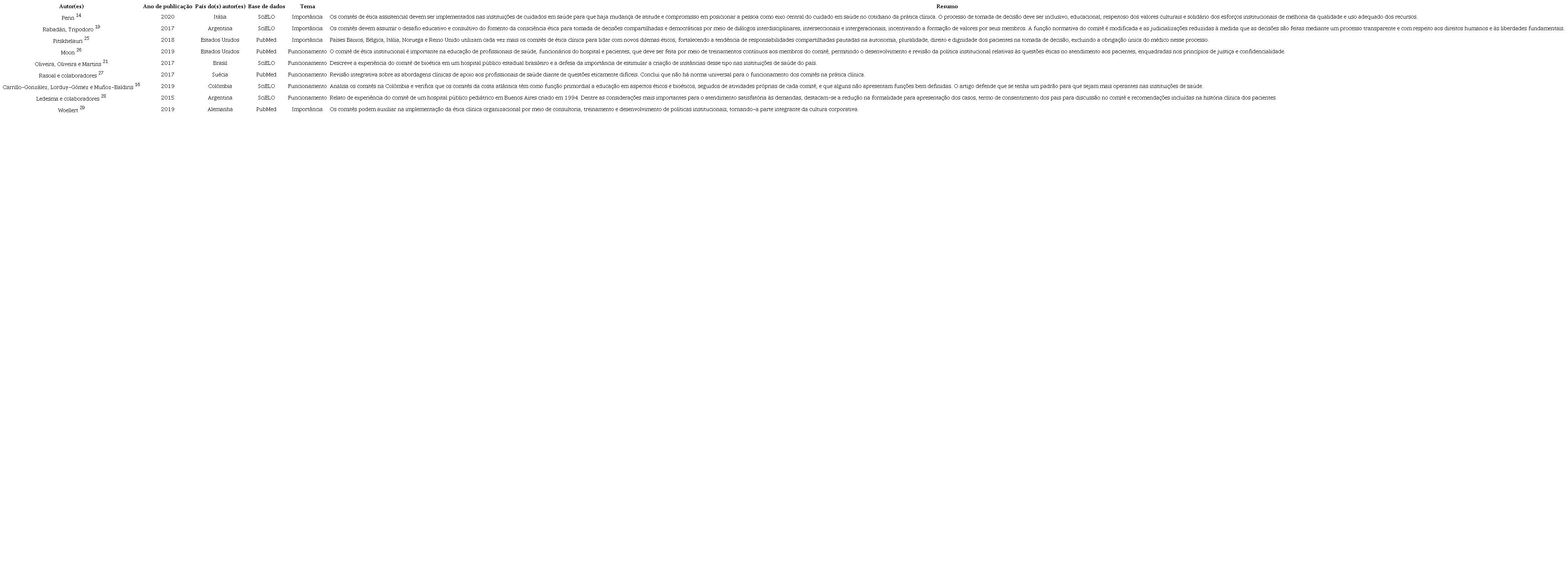 Dentre os artigos analisados, o mais antigo é de 2015, e a maior parte dos estudos é de cunho teórico sobre comitês de bioética e descrevem a situação deles em seus respectivos países ou continentes. Todos defendem a importância desses comitês para processos de tomada de decisão nas questões de saúde, padronização e composição multidisciplinar. Ressalta-se que foi encontrado apenas um artigo brasileiro nas bases de dados consultadas que se adequava ao escopo e ao método elegido.