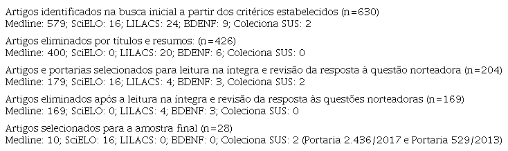 Os critérios de inclusão foram: artigos com resumos disponíveis nas bases de dados selecionadas, oriundos de pesquisa original e de revisões de literatura, publicados em qualquer idioma, entre janeiro de 2013 e agosto de 2018. Foram excluídos estudos com desenho de pesquisa ou objetivos pouco definidos, resumos e anais de congressos, comentários, opiniões, notas prévias, relatórios, dissertações, teses e monografias. Além dos artigos, a revisão incluiu a Portaria 2.436/2017 4 e a Portaria 529/2013 17 , do Ministério da Saúde (MS), que tratam do tema pesquisado. A identificação, a seleção e a apresentação dos 26 artigos e duas portarias 4 , 17 selecionados podem ser visualizadas no Quadro 1 .