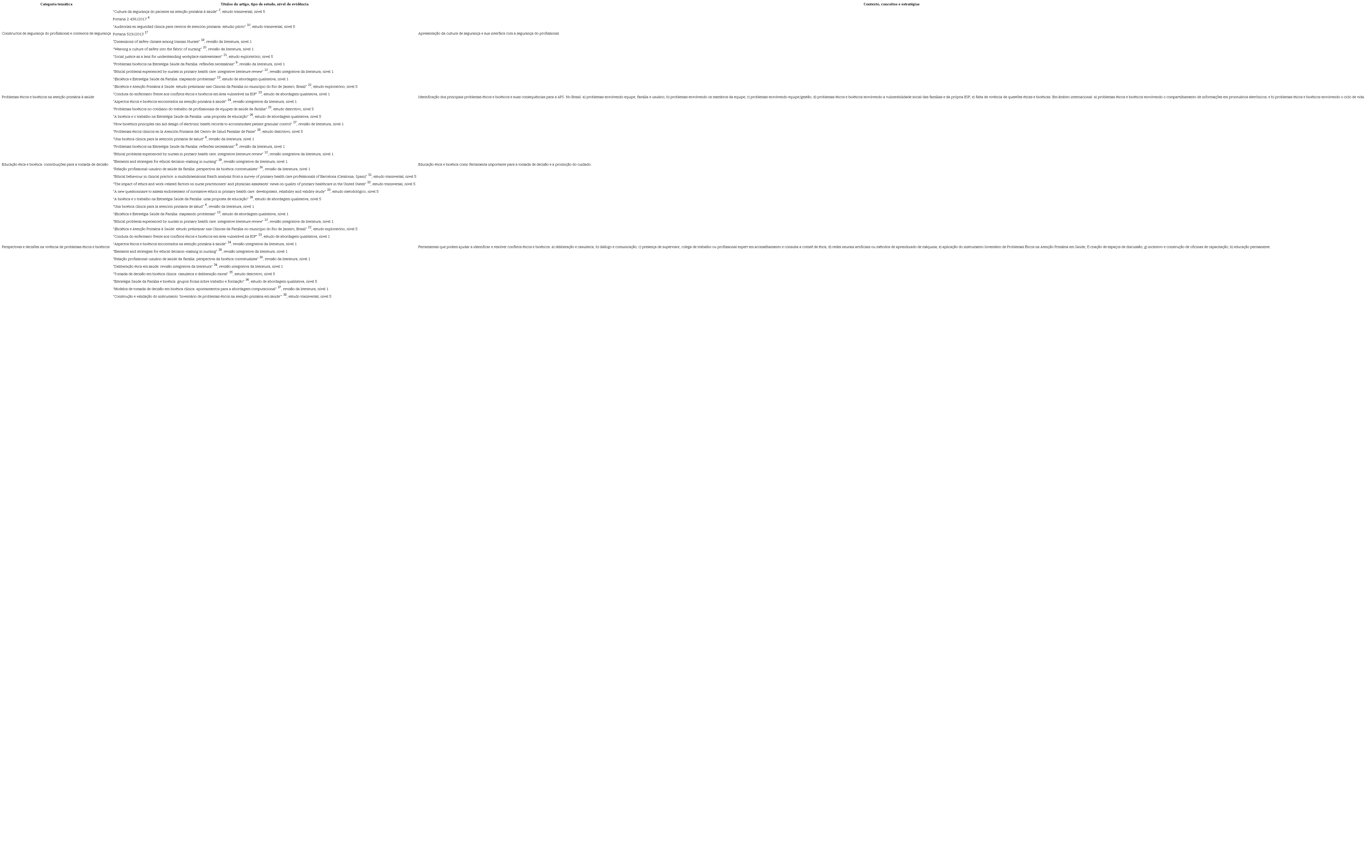 Na análise de conteúdo dos 26 artigos, foram identificadas quatro categorias temáticas: 1) constructos de segurança do profissional e contextos de segurança; 2) problemas éticos e bioéticos na atenção primária à saúde; 3) educação ética e bioética: contribuições para a tomada de decisão; e 4) perspectivas e decisões na vivência de problemas éticos e bioéticos. O Quadro 2 apresenta os artigos classificados conforme as categorias temáticas.
