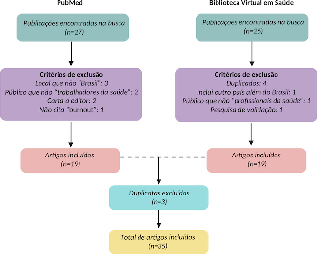 Foram consultadas duas bases de dados. A pesquisa no PubMed envolveu os descritores “burnout” e “health personnel”, extraídos do Medical Subject Headings. Na Biblioteca Virtual em Saúde foram utilizadas as palavras-chave “burnout” e “pessoal de saúde”, extraídas dos Descritores em Ciências da Saúde. Em ambos os casos os descritores foram usados em associação com o operador booleano “and”.