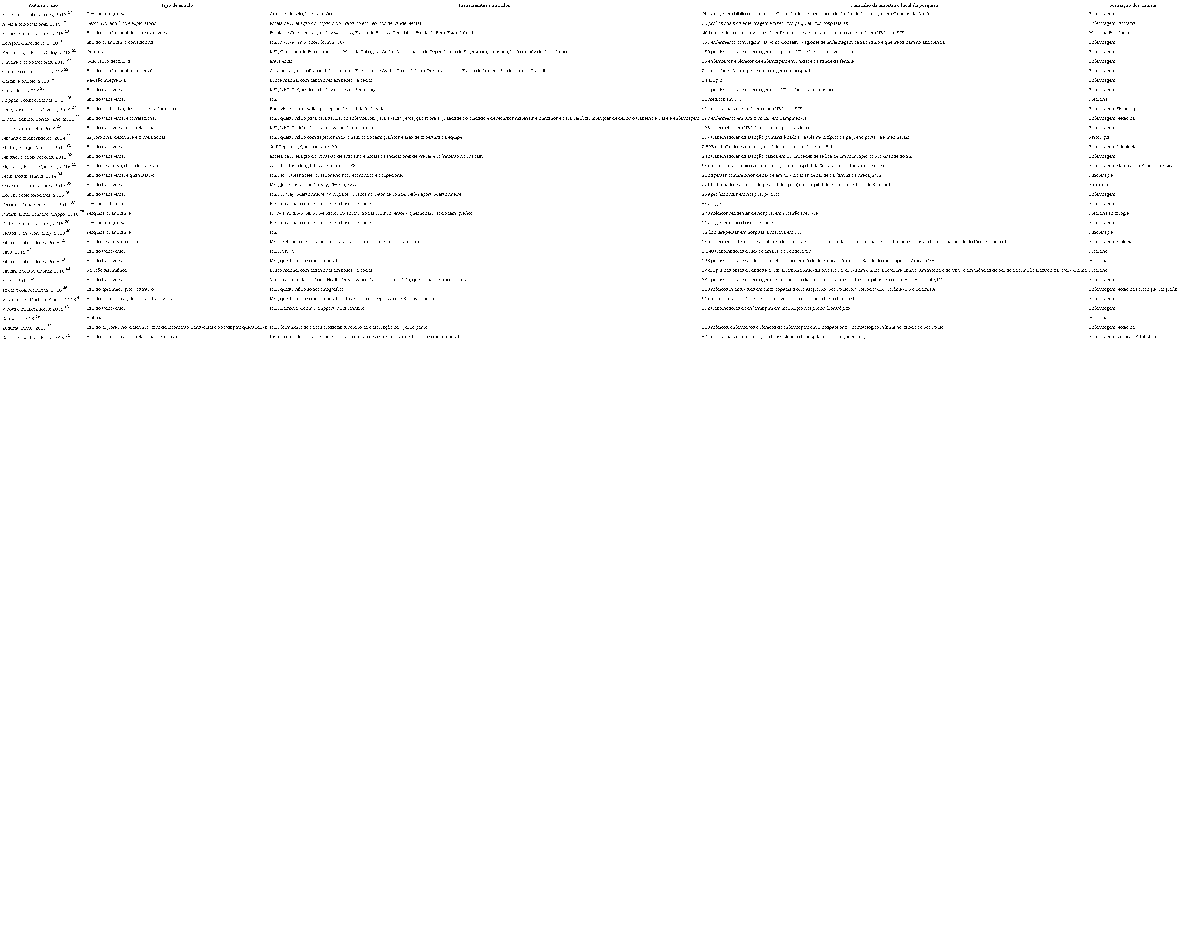 Os dados foram coletados de forma independente pelas duas autoras e os resultados foram comparados para obter maior fidedignidade. Não foi utilizada ferramenta para selecionar e extrair dados. Após essa etapa, o corpus foi classificado de acordo com tipo de estudo, instrumentos utilizados, tamanho da amostra, local de pesquisa e formação dos autores (Tabela 1).