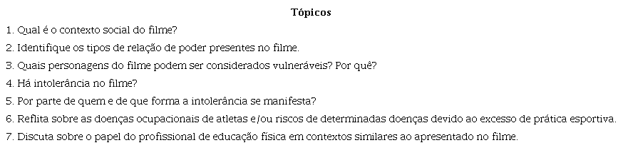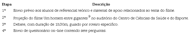 Antes da projeção de Um homem entre gigantes9 , os participantes assistiram a documentário de curta-metragem 11 e leram um artigo científico 12 e uma reportagem jornalística 13 relacionados ao tema do filme. O material foi enviado aos alunos por e-mail uma semana antes da data marcada para a exibição do longa. Após a sessão, as pesquisadoras conduziram debate com duração de uma hora e meia, seguindo roteiro com perguntas sistematizadas: 1) Existem relações de poder no filme? Quais? Como elas se manifestam?; 2) Racismo ou intolerância podem ser notados no filme? Se sim, em quais momentos e de que modo?; e 3) Quais são os fatores de risco e as doenças ocupacionais dos atletas? Como tais enfermidades podem ser prevenidas e tratadas?