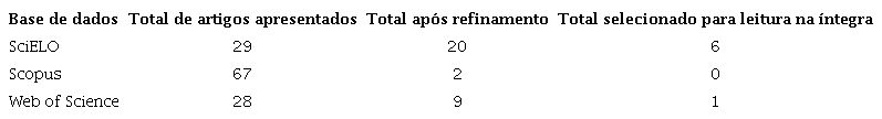 A primeira parte da busca, sem refinamento, retornou 124 artigos: 29 na SciELO, 67 na Scopus e 28 na Web of Science. Após essa fase inicial, foram aplicados os critérios de inclusão e restaram 31 artigos. Os títulos e resumos desses textos foram avaliados e, por fim, sete artigos – todos os que respondiam à questão norteadora da pesquisa – entraram na amostra da revisão integrativa. O Quadro 1 detalha a busca realizada nas bases de dados.