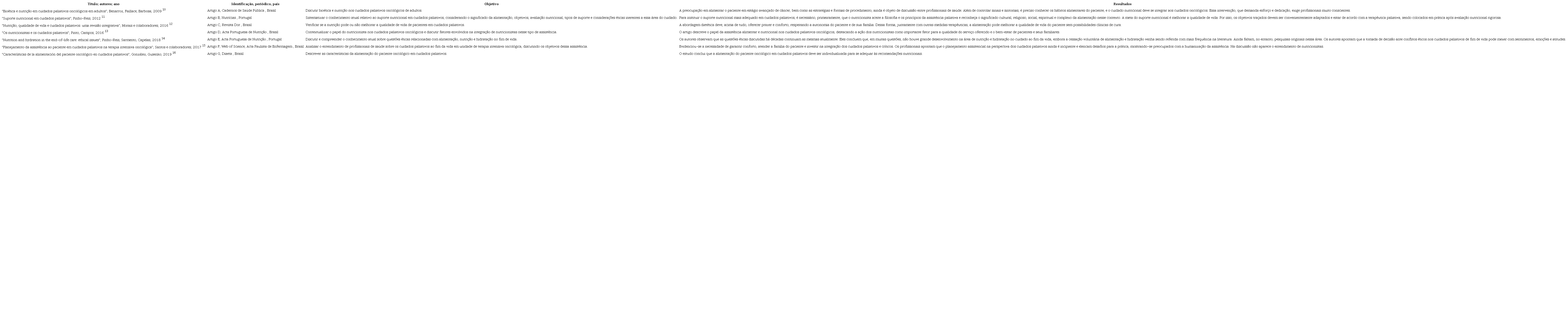 Observa-se que, do total de estudos encontrados na primeira fase da busca, poucos tratavam da atuação do nutricionista nos cuidados paliativos em fim de vida. O Quadro 2 apresenta os sete artigos que compõem a amostra da pesquisa.