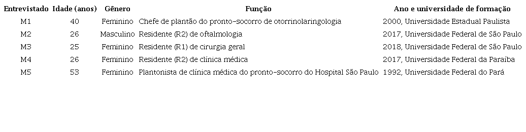 Conforme disposto no Quadro 1 , foram entrevistados cinco médicos, quatro mulheres e um homem, com idade entre 25 e 53 anos, todos graduados em universidades públicas. Os três profissionais mais jovens eram vinculados ao programa de residência médica do HSP/Unifesp.
