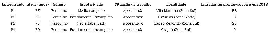 Foram entrevistados quatro pacientes, três mulheres e um homem, caracterizados no Quadro 2 . Os entrevistados tinham entre 70 e 75 anos, eram aposentados e moravam na região de abrangência do PS-HSP. Apenas uma participante havia completado o ensino médio, e ninguém tinha plano privado de saúde. A frequência de uso em 2018 indica que os pacientes selecionados eram de fato hiperutilizadores, especialmente P1 e P3, que compareciam ao serviço, em média, a cada 6 e 14 dias, respectivamente.