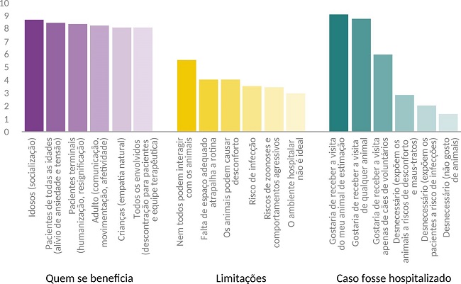 Para os voluntários, os pacientes influenciam o comportamento dos animais, que parecem preferir crianças, mulheres e idosos. Como benefícios para o paciente, os voluntários elencam: felicidade (47%), melhora global (19%), boas recordações (15,5%), relaxamento (12,5%), melhora na autoestima (3%) e aceitação (3%). Para os animais: satisfação (61%), interação (28%) e calma (11%). Para a instituição: melhora do ambiente (69%) e rápida recuperação (31,3%). Para os voluntários: felicidade (64,3%), plenitude (28,6%) e nenhum benefício (7,1%). As limitações identificadas nos pacientes foram: rejeição (72%) e estranhamento (28%). Nos animais: manipulação (66,6%) e exaustão (33,3%). Na instituição: restrições (77,8%), desconhecimento (11,1%) e falta de local adequado (11,1%). Nenhuma limitação relativa aos próprios voluntários foi identificada.