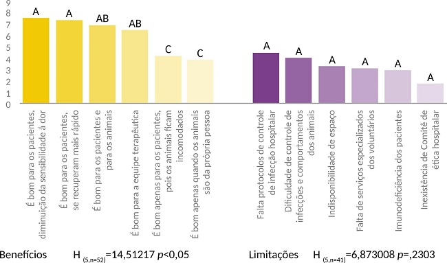 A percepção da equipe terapêutica foi colhida em entrevistas com 12 enfermeiros e técnicos de enfermagem que atuam em hospitais em média há 274±114 meses (12; 1-240). A opinião dos participantes foi positiva, destacando a alegria e a melhora do ambiente. Apenas um dos profissionais alertou para o risco de contaminação. Três entrevistados disseram desconhecer o motivo das visitas, dois citaram a humanização e o bem-estar, e três a distração. Melhoras nos pacientes, relativas principalmente ao humor, foram identificadas por 11 entrevistados, e todos afirmaram que a AAA melhora o trabalho da equipe. Nenhum entrevistado percebeu inconvenientes ou interferência na rotina do hospital. Apenas três disseram conhecer protocolos, destacando o treinamento dos cães, a limpeza das patas e a duração da visita (uma hora). A existência de protocolos oficiais tornaria a intervenção mais eficiente para sete dos entrevistados, e a periodicidade foi considerada importante por todos. Apenas três entrevistados opinaram quanto à duração da visita (15, 30 e 90 minutos), e todos concordaram que a visita do animal do paciente seria melhor do que a de voluntários. A identificação com assertivas sobre benefícios revelaram maior atribuição de benefício aos pacientes. Quanto a limitações, não houve diferenças ( Figura 2 ).
