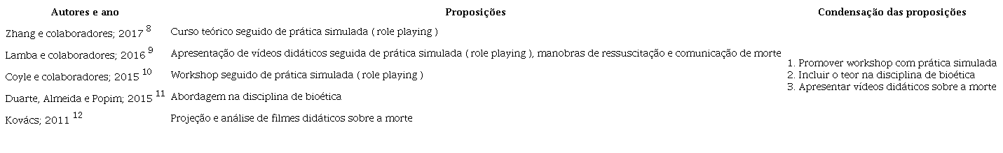 Nas três categorias analisadas ( Quadros 1 , 2 e 3 ), os artigos apresentaram dez proposições relevantes aos profissionais de saúde, sobretudo aos médicos, a respeito da difícil tarefa de comunicar a morte de paciente a seus familiares. Em relação à formação profissional ( Quadro 1 ), em três dos cinco artigos e resumos selecionados 8 - 10 emerge a primeira proposição, que é a prática simulada com role playing , precedida de introdução teórica por meio de apresentações expositivas ou filmes didáticos. Portando, infere-se que essa seja a metodologia mais indicada para o desenvolvimento de habilidades e controle emocional dos profissionais durante a comunicação de morte.