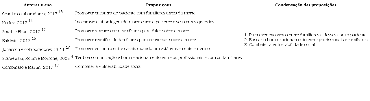 Sete artigos propunham formas de preparar os familiares para a comunicação da morte de paciente ( Quadro 2 ). A promoção do encontro entre familiares e paciente quando a morte é iminente facilita sua aceitação e contribui para que haja menos depressão durante o luto, constituindo a primeira proposição 13 .