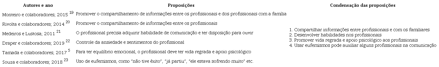 Seis artigos traziam proposições sobre a prática profissional para a comunicação de morte de paciente a familiares. A primeira indicava que o compartilhamento da verdade sobre o paciente em iminência de morte entre os profissionais da equipe, sem atitude de negação ou velamento, facilita o processo de comunicação aos familiares. Esta deve ser feita de preferência pelo médico que mais se relaciona com a família e que tenha o respectivo preparo ético e técnico para a função 19 .
