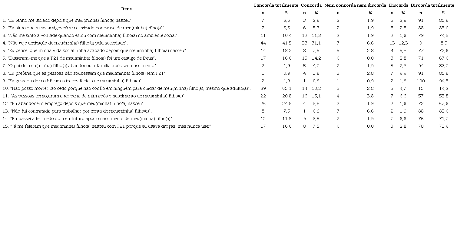 Quanto às questões sobre isolamento e afastamento social, 94 (88,7%) participantes declararam que não se isolaram; 91 (85,8%) não foram evitados por amigos; e 81 (76,4%) não reconheceram ter em algum momento pensado que a vida social havia acabado. Quando o assunto se referia a fator psicossocial relacionado a vergonha, 81 (76,4%) respondentes discordaram da afirmação “não me sinto à vontade quando estou com meu(minha) filho(a) no ambiente social”; 98 (92,5%) discordaram de “eu preferia que as pessoas não soubessem que meu(minha) filho(a) tem T21”; e 102 (96,2%) discordam que gostariam de modificar os traços faciais do(a) filho(a). Em relação ao fator psicossocial associado à inferioridade, 74 (69,8%) relataram não ter ouvido alguém dizer que a condição genética do filho teria sido castigo de Deus; e 64 (60,4%) genitores responderam que as pessoas não passaram a ter pena após o nascimento do(a) filho(a). Quanto à associação da T21 a drogas, 81 (76,4%) respondentes negaram essa afirmação.