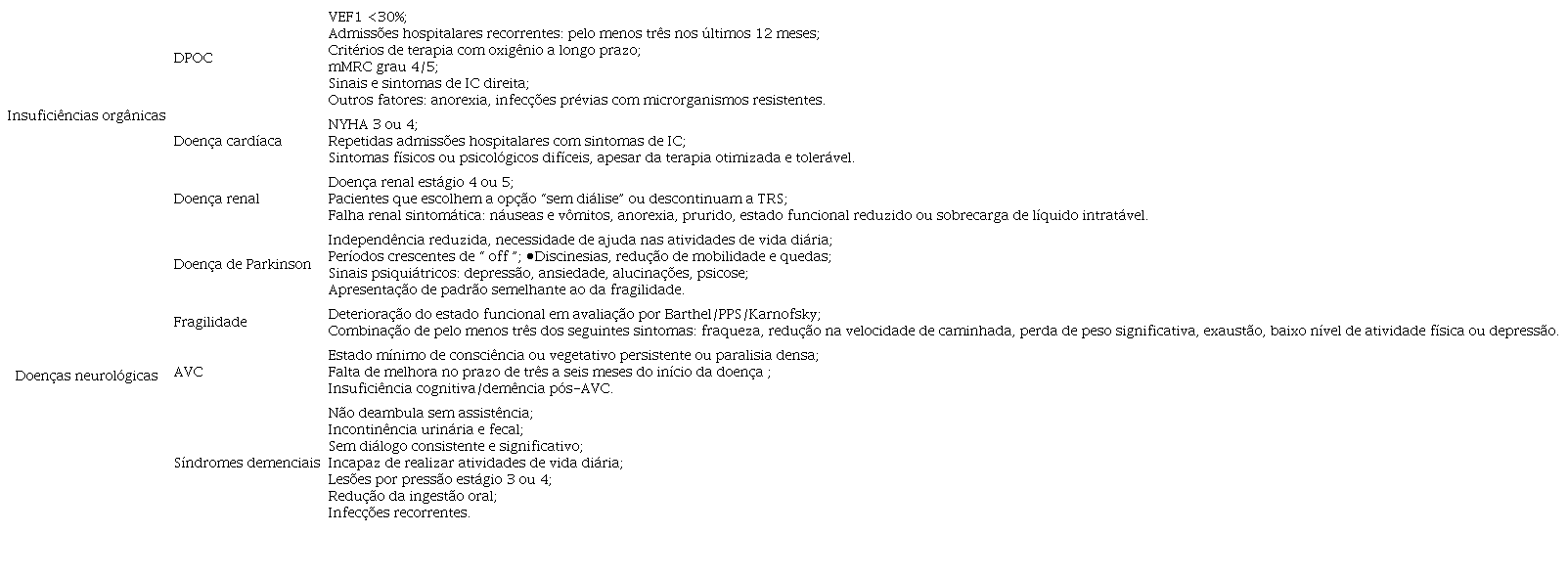 As trajetórias características de doenças crônicas, como insuficiências orgânicas e patologias neurológicas, apresentam declínio errático. O Quadro 1 mostra de forma resumida alguns indicadores de doença avançada em morbidades específicas.