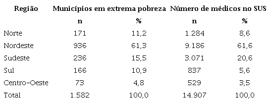 Dentre os médicos que exercem suas atividades profissionais pelo SUS nos 1.526 municípios brasileiros em extrema pobreza, 1.284 (8,6%) atuam na região Norte; 9.186 (61,6%), no Nordeste; 3.071 (20,6%), no Sudeste; 837 (5,6%), no Sul; e 529 (3,5%), no Centro-Oeste ( Tabela 1 ).