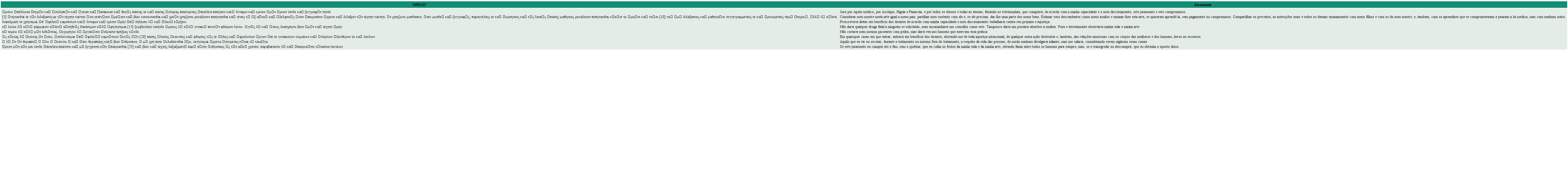 O textus receptus, ou “texto recebido” ( Quadro 1), do Juramento de Hipócrates é uma combinação de vários manuscritos semelhantes, especialmente do Vaticanus graecus 276 (V), um códex da biblioteca do Vaticano, e é chamado de “juramento pagão” 1, 2. Há outras versões do juramento em grego, incluindo uma em verso, uma cristianizada e uma bastante fragmentária, a mais antiga de todas, nos papiros de Oxirrinco – estes, encontrados no Egito, contêm documentos do século III a.C. ao século VII d. C. 3– 5. As diferenças entre esses documentos, porém, é discussão que foge ao escopo desta revisão.