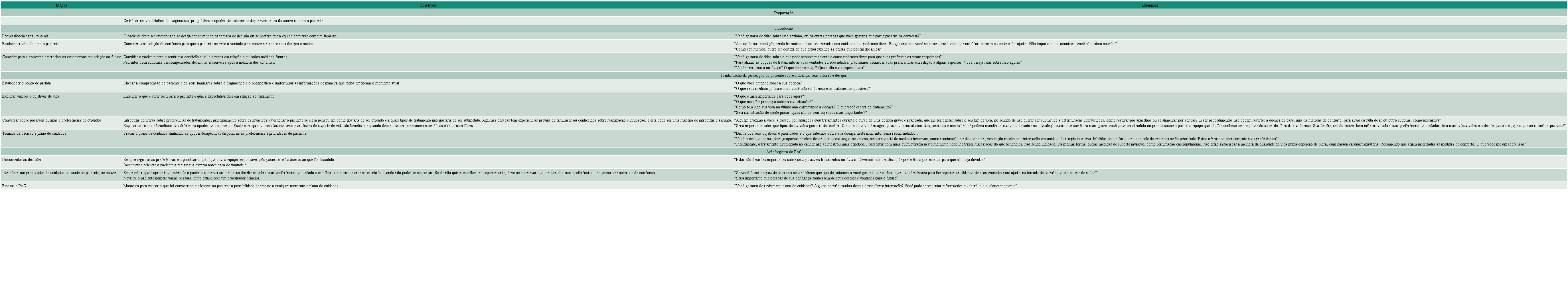 Preparação: antecede a conversa com o paciente, incluindo revisão completa do histórico clínico, prognóstico e opções de tratamento. Além disso, informações sobre os aspectos psicossociais e dinâmica familiar podem ser acessados na discussão com outros membros da equipe de saúde.