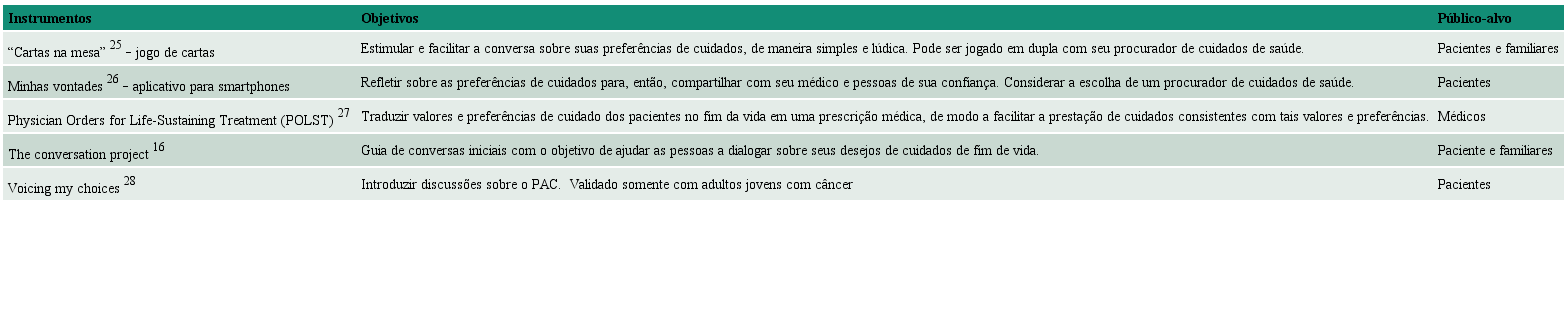 Há vários instrumentos utilizados com o objetivo de facilitar a conversa sobre preferências de cuidados no fim da vida e, assim, permitir a construção de DAV, mas poucos já validados e adaptados à realidade brasileira – a maioria são instrumentos de outras línguas e culturas, principalmente norte-americanos. É importante enfatizar que tais instrumentos não excluem – pelo contrário, reforçam – o papel dos médicos na conversa sobre esses objetivos de cuidados. É essencial a orientação dos profissionais de saúde nesse processo, incluindo a conversa sobre a doença e o prognóstico.