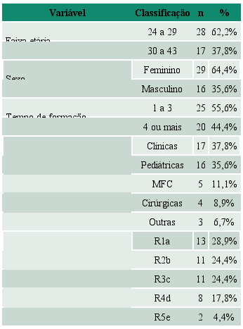 Aplicados os critérios de inclusão, obteve-se amostra de 45 participantes, composta majoritariamente de médicos residentes do sexo feminino, com idade mediana de 29 anos, com 1 a 3 anos de formação, cursando o primeiro (R1), segundo (R2) ou terceiro (R3) anos de residência de alguma especialidade clínica.