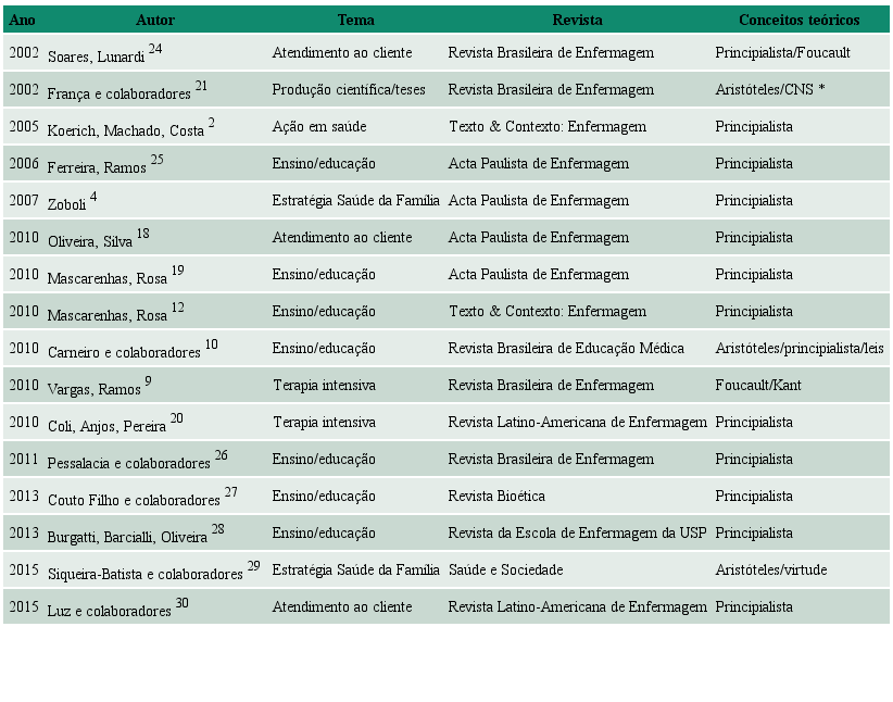 Com relação aos periódicos em que foram publicados, quatro artigos estavam na revista Acta Paulista de Enfermagem, dois na revista Texto & Contexto: Enfermagem, dois na Revista Latino-Americana de Enfermagem e quatro na Revista Brasileira de Enfermagem. Por fim, selecionou-se um artigo de cada um dos seguintes periódicos: Revista Brasileira de Educação Médica, Revista Bioética, Revista da Escola de Enfermagem da USP e Saúde e Sociedade. Quanto à área temática da SciELO, 15 artigos estavam classificados como ciências da saúde e um como ciências humanas. Sobre o ano de publicação, a maioria dos artigos foram publicados no ano de 2010 (seis artigos), seguido dos anos de 2002 (dois), 2013 (dois), 2015 (dois), 2005 (um), 2006 (um), 2007 (um) e 2011 (um).