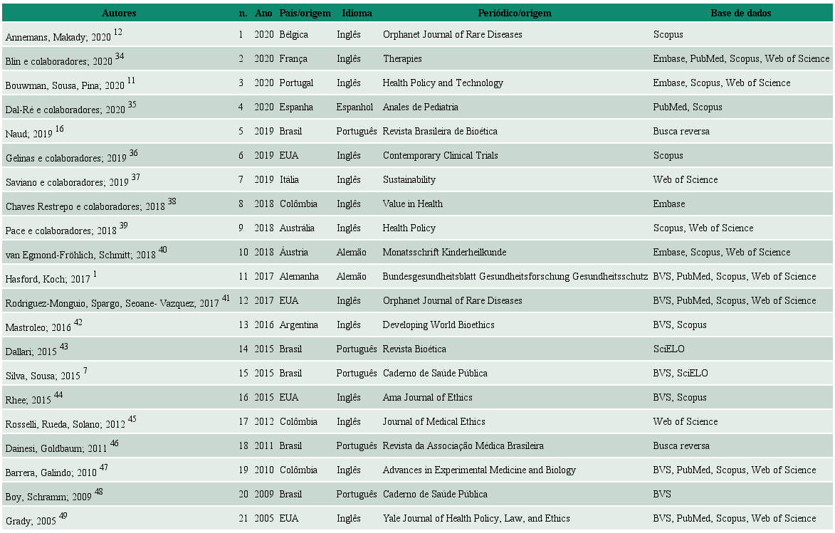 abstrat: This study is an integrative literature review to analyze the scientific production about post-trial access to drugs by participants of clinical trials with rare diseases. The search was carried out in the Virtual Library in Health, Embase, PubMed, SciELO, Scopus and Web of Science databases, covering 21 studies. Two categories emerged from the analysis: clinical research with orphan drugs and market regulation; and access to orphan drugs: history, globalization and the right to health. The first analyzes issues related to the number of patients with rare diseases, the efficacy and safety of these studies and the costs and prices of medications. The second deals with the historical panorama of post-trial access, the globalization of clinical trials and the difficulties to effect the right to post-trial access to orphan drugs. Few articles addressed post-trial access to the drug by participants with rare diseases as a central issue, which points to the importance of further studies on this subject.