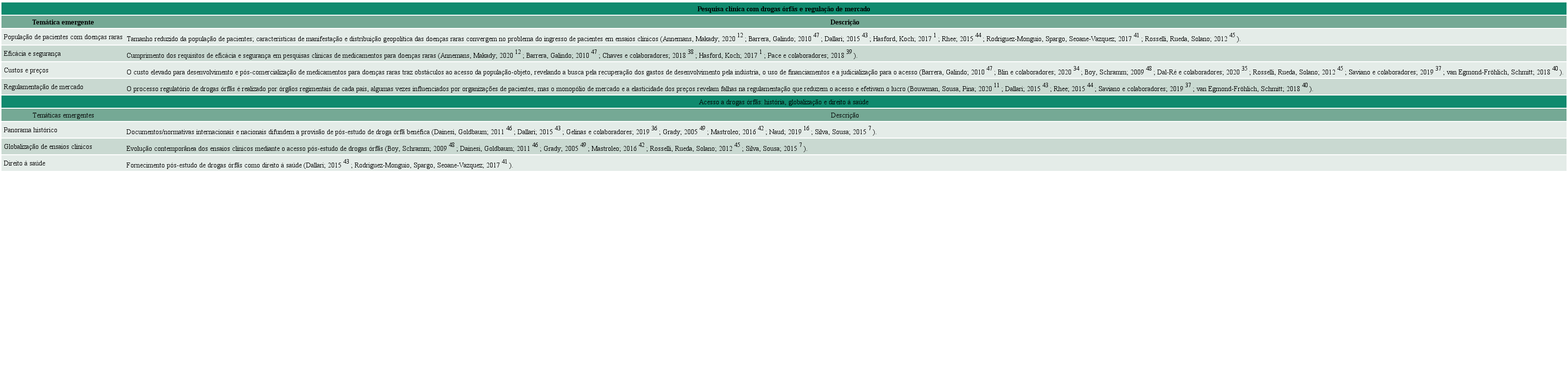 A temática relacionada ao princípio do fornecimento de droga órfã no pós-estudo clínico foi apontada por nove artigos. Os autores relataram que aspectos éticos relacionados a pesquisas com seres humanos são regidos, historicamente, por diversos documentos.